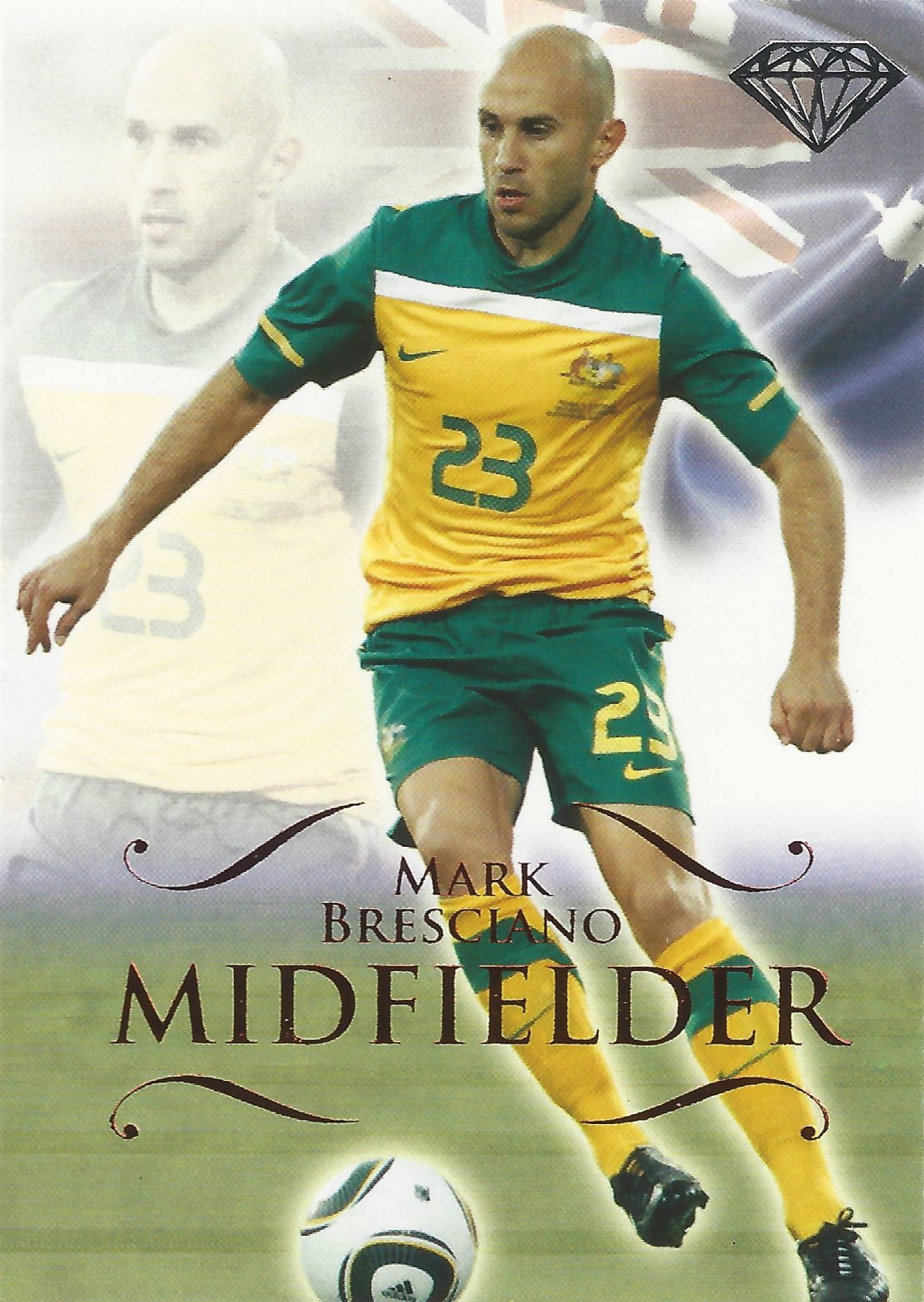 After the 2006 World Cup Mark transferred to another Serie A club, Palmero. In addition to the standard Panini portrait stickers the collection includes an action sticker from the 2008-09 season where the same image was also used on the Panini “Real Action” card from that year. Probably the most interesting club item in the collection is a 2006-07 postcard produced in conjunction with a radio station. The card has a picture of the classic Mark Bresciano goal “Statue Celebration” pose. Similarly the only club programme in the Bresciano collection is a 2009 Palmero v Udinese that has thee Bresciano statue pose on the cover (Featured index card above). From his last season at Palmero, there is unusual a Panini Atomic round clear plastic card and a Metal Dog Tag card. In 2010-11, following another World Cup campaign Mark made to his final Serie A transfer to Lazio. The collection comprises three Lazio items including another “Atomic” clear plastic card.