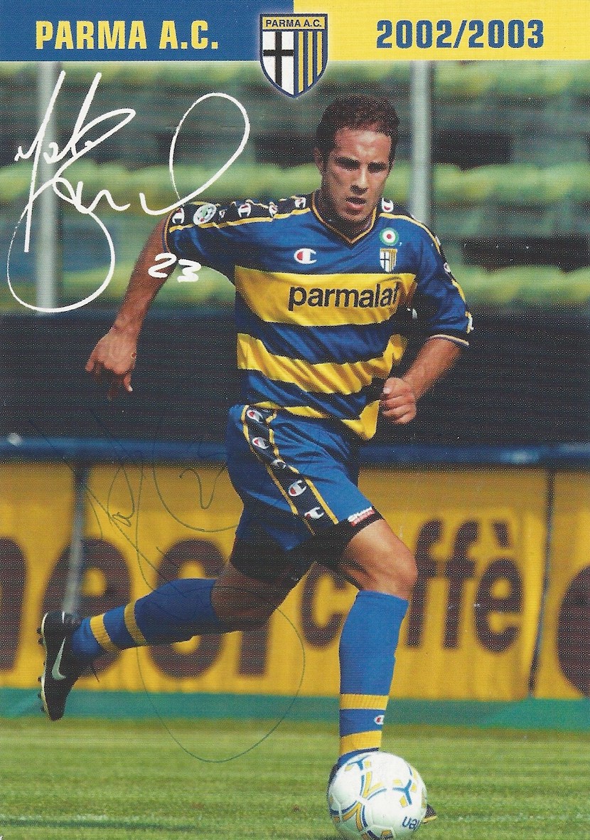 At Empoli, in Serie B, he appeared on Panini stickers with a teammate on the same sticker. I have only shown his part of the sticker with the exception of the 2001-02 season where he is paired with his fellow Socceroo and Empoli teammate Vince Grella. At the end of the 01-02 Empoli were promoted to Serie A but Mark then transferred to Parma, another Serie A club.
